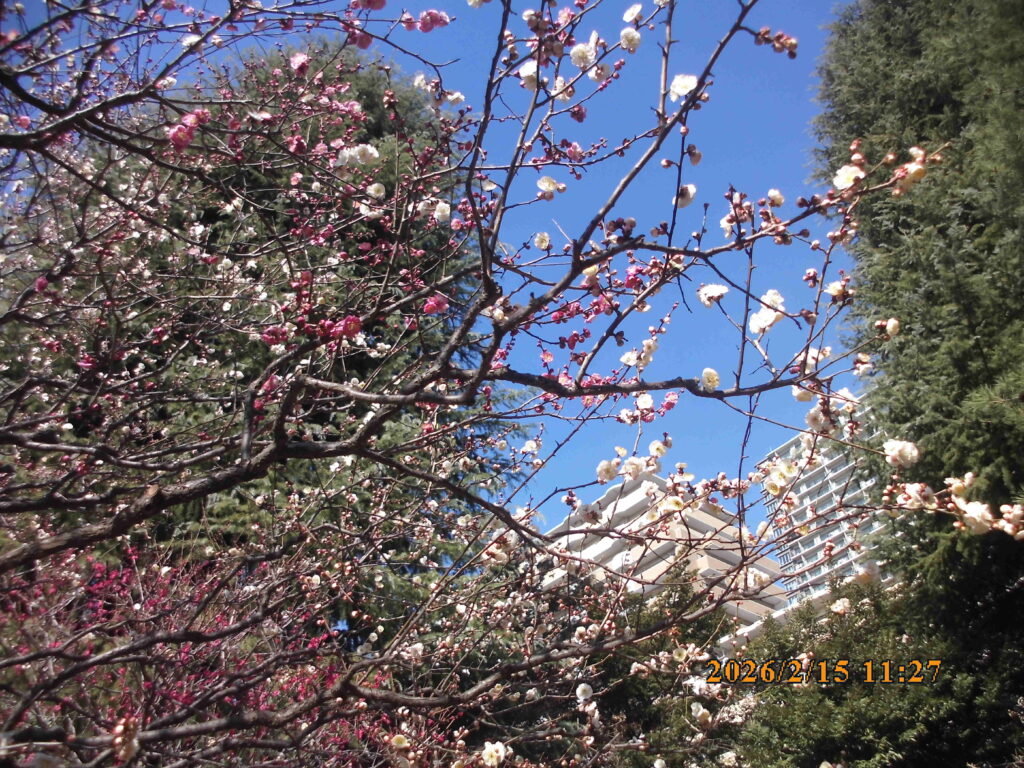 代わりに、紅葉亭へ行く途中の小高い丘の上の白と赤及びピンクの梅の花が咲き始めていました。